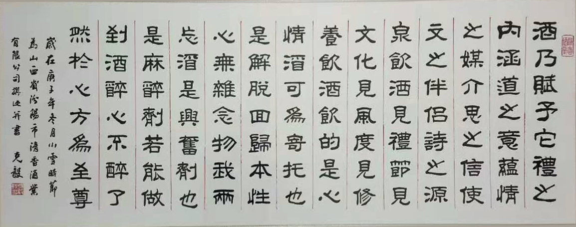 汾陽市清香酒業有限公司座落在中華名酒第一村---杏花村申明亭路9號。《汾酒曲》中記載,申明亭畔新淘井,水重依稀亞蟹黃 ,注解說:申明亭井水絕佳,以之釀酒,斤兩獨重。明末愛國詩人、書法家和醫學家傅山先生,曾為申明亭古井親筆題寫了得造花香四個大字,說明杏花井泉得天獨厚,釀出的美酒如同花香沁人心脾。 汾陽市清香酒業有限公司出品的清香型高端白酒用的是優質高粱、大麥和豌豆等上等原料和申明亭地下礦泉水,再加上杏花村土壤和空氣中獨有的菌群,在杏花村釀酒匠人的傳統工藝下精心釀造:清蒸二次清,固態地缸分離發酵,清字當頭,一清到底,釀出的酒:酒液晶亮、清香幽雅、醇凈柔和、回甜爽口、飲后余香,在國內外享有盛譽。